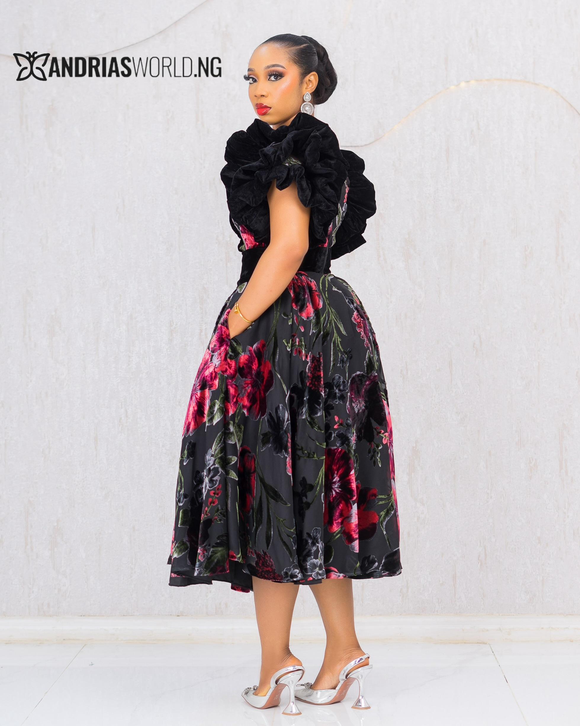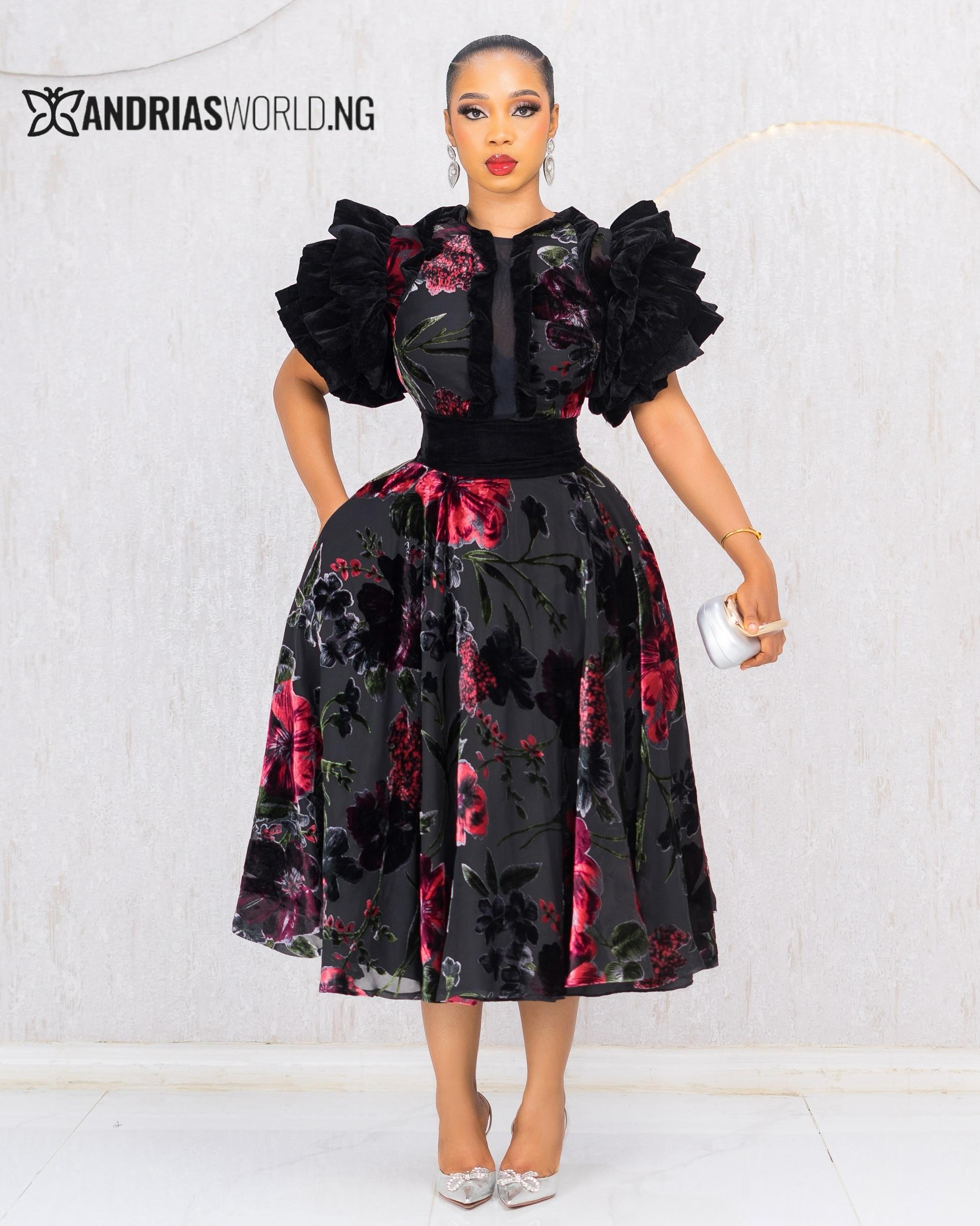 BLACK FLORAL VELVET DRESS WITH PUFFY SLEEVES