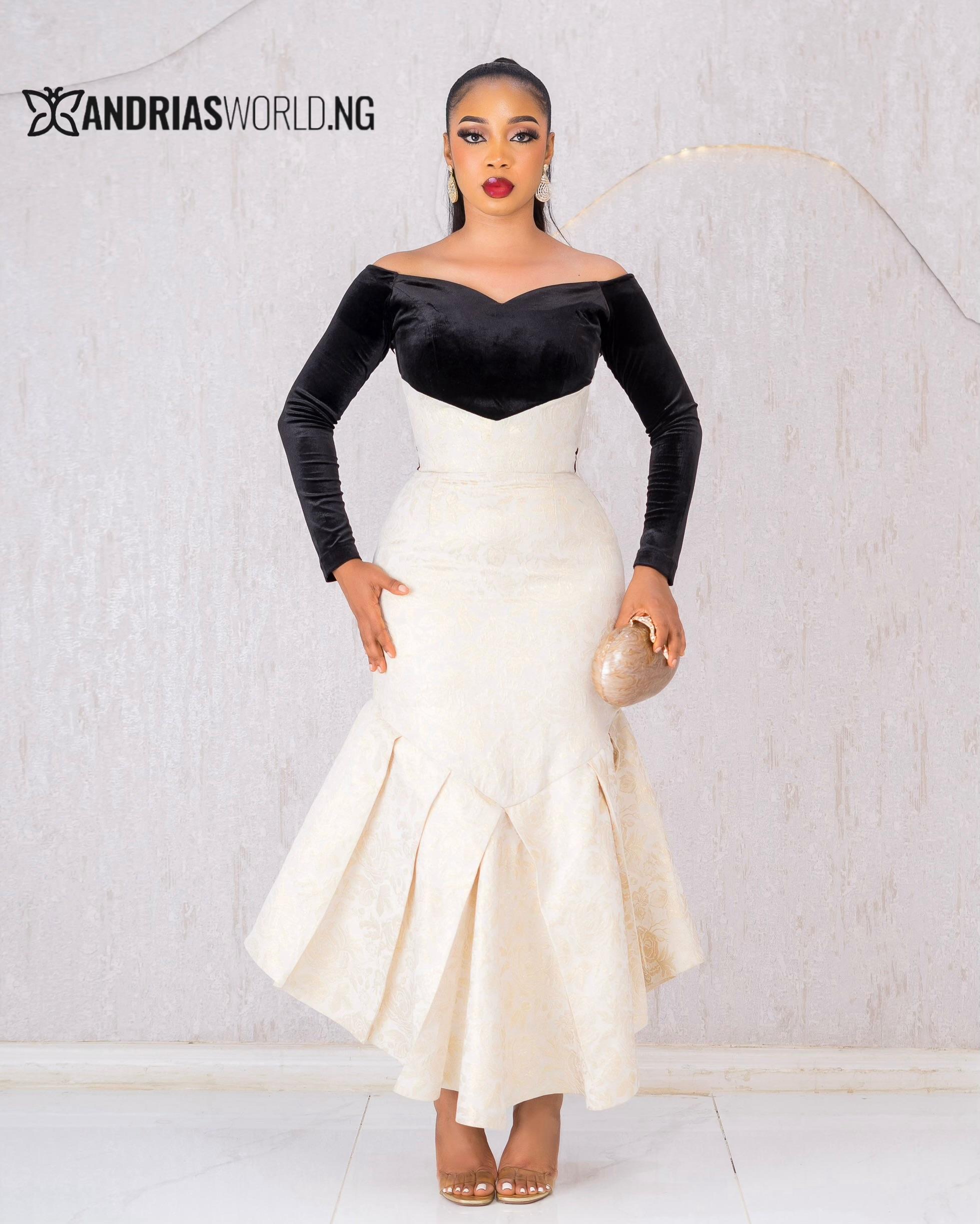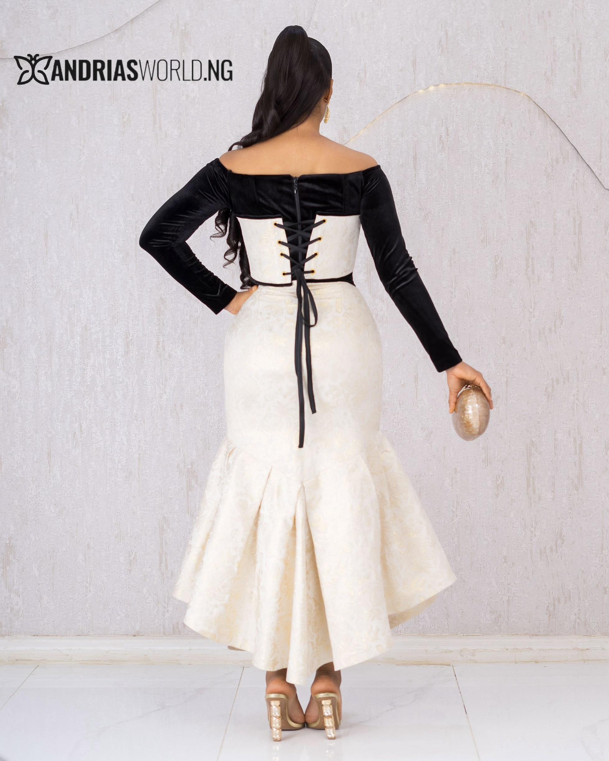BLACK VELVET AND CREAM DAMASK FISHTAIL DRESS