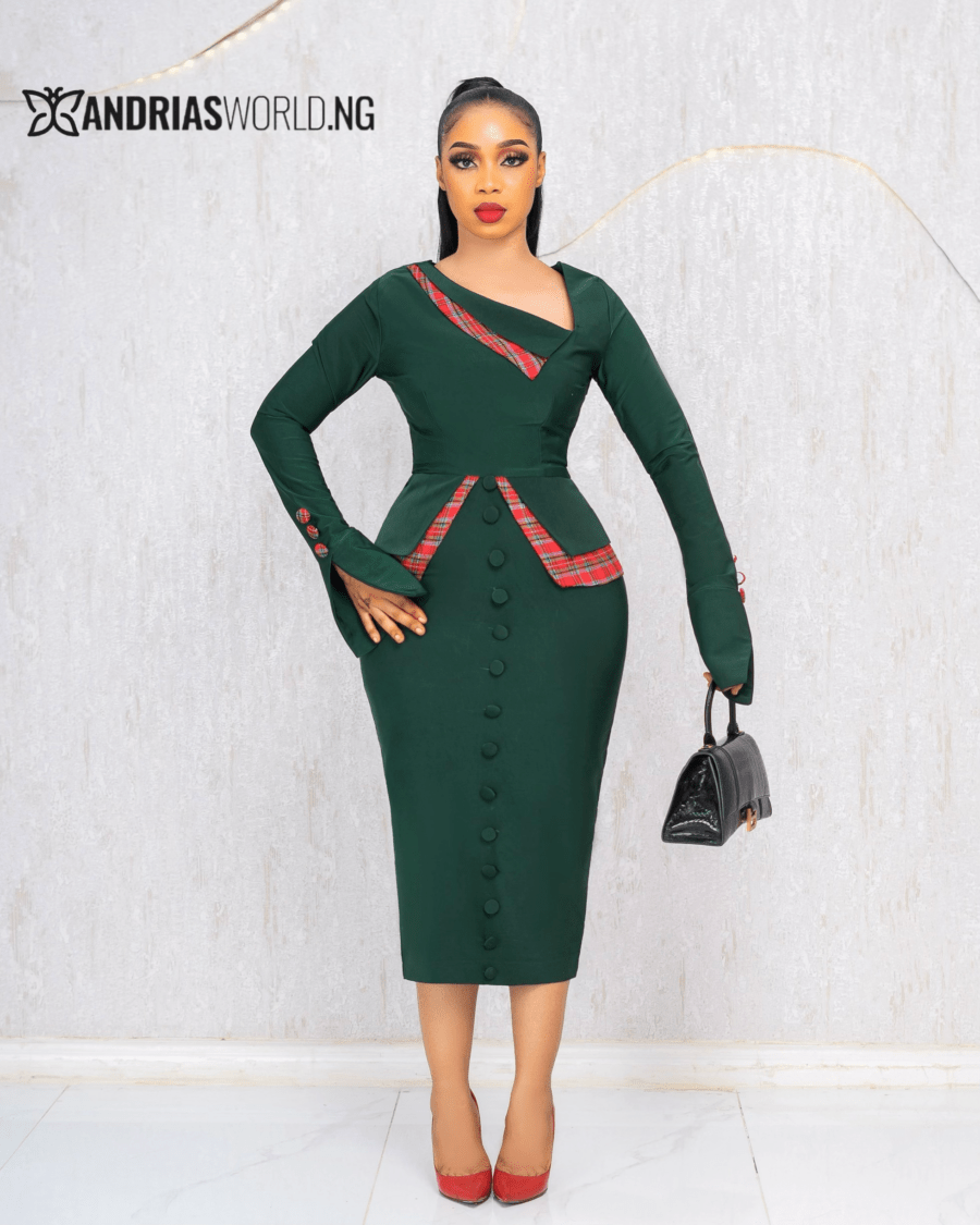 GREEN BUTTON DRESS WITH RED CHECK DETAILS